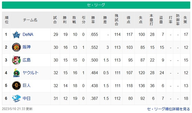 【5/10】●●●●●●●中日 ●●●●読売 ●東京 広島 阪神○○○ 横浜○○○○○○○○○
