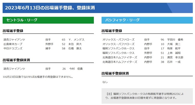 【6/13公示】巨人・今村が登録抹消 広島・末包、中日・石橋、オリックス・宇田川優希、日本ハム・清宮らが一軍登録