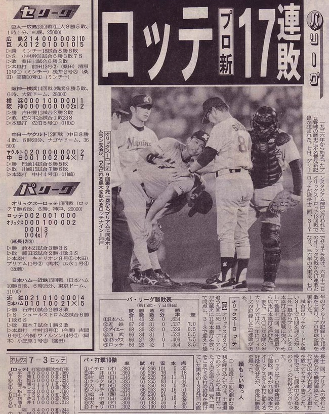 ロッテ17連敗 エース黒木が勝利目前プリアムに同点2ラン→延長で代打広永満塁弾